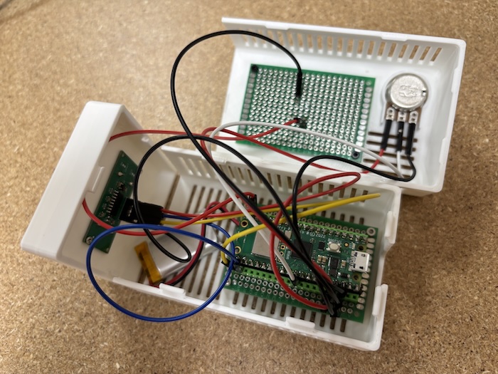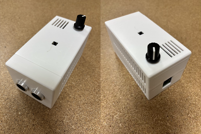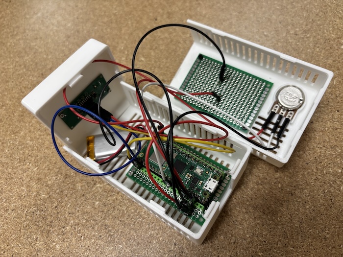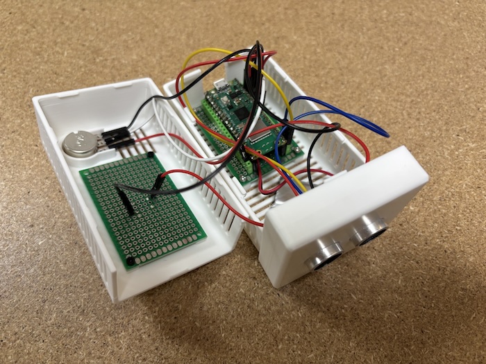 The Pico runs a Python script which collects distance information and formats it in centimeters. It also reads the potentiometer (main volume control) and button state. It then formats all of this as an OSC message and sends the data through UDP to the local WiFi network. A computer or laptop on the same WiFi network can read this data in Pd. The button cycles through simple patches students create in Pd that do anything with a single variable in the audio domain. ![]() ![]() ![]() All of the electronics are insidea small 3D printed enclosure. We are currently working on fabricating a PCB so we can build many of these. Once we have several of these devices, we can use a very nifty feature to make ensemble music with them. Each device sends out an individual index code (e.g., 10, 11, 15, 29). Then, all of the devices on the WiFi network can send their data to the same Pd patch, which can route their distance information into a polyphonic patch. Each performer can also cycle through different patches they've created, which are uniquely assigned to their device. The laptop serves as a "hub" that receives data from all the ensemble players, processes it, and routes audio to loudspeakers. ![]() ![]() Content on this page is licenced under GNU General Public License. |